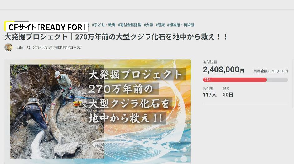 CFサイト「READY FOR」の大発掘プロジェクト 270万年前の大型クジラ化石を地中から救え!!(7月18日まで)