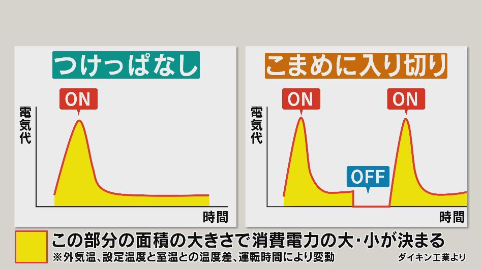 また、エアコンは「立ち上がり」の消費電力が大きいため、つけたり、切ったりは控え、30分程度の外出ならつけっ放しの方が抑えられるということです。