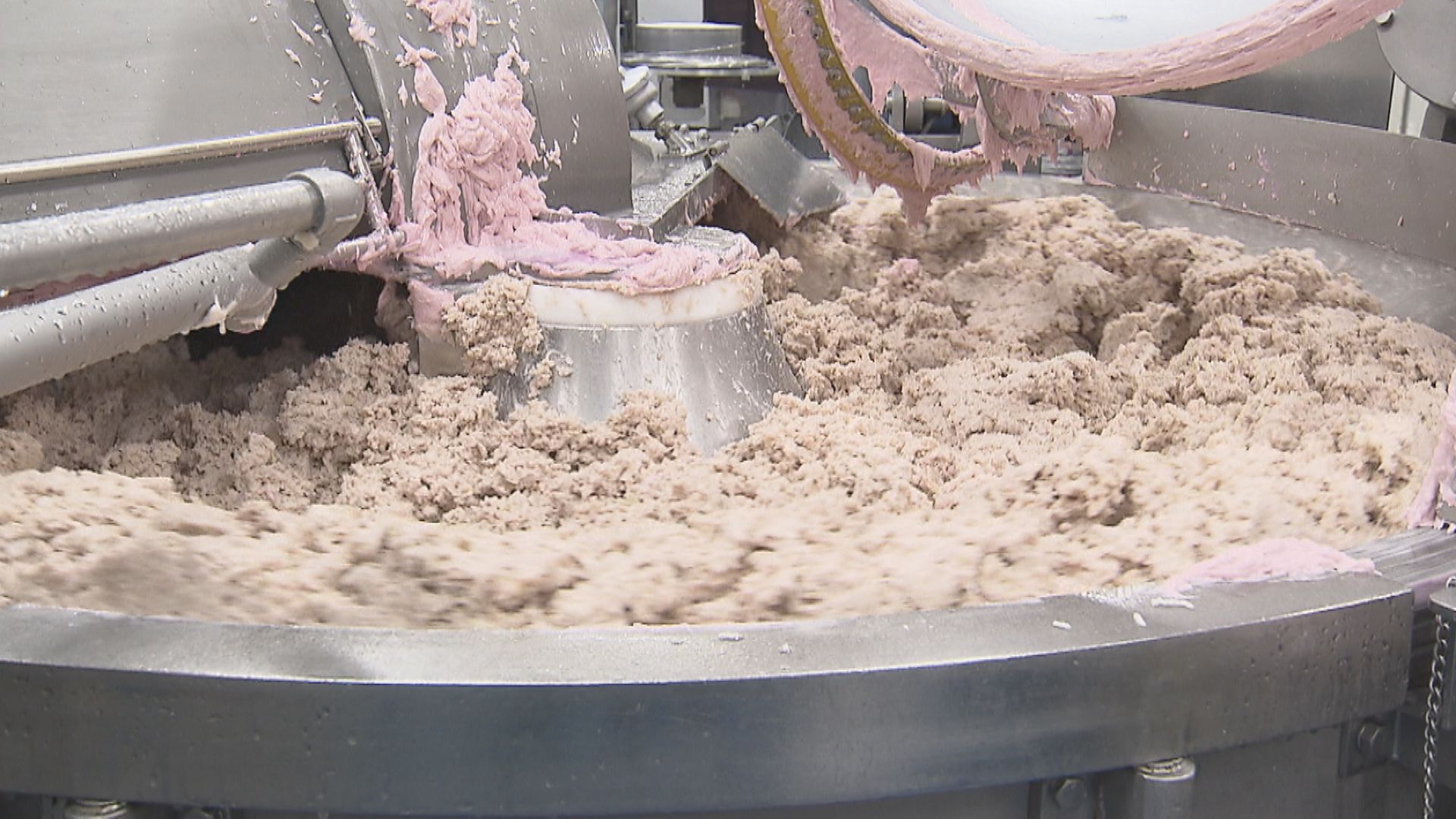 「この練り(の工程)は非常に重要で、ホモソーセージの由来でもある「ホモジナイズ」、均一化してしっかり練りこむことによって丸善特有の弾力、食感がここで生まれます」