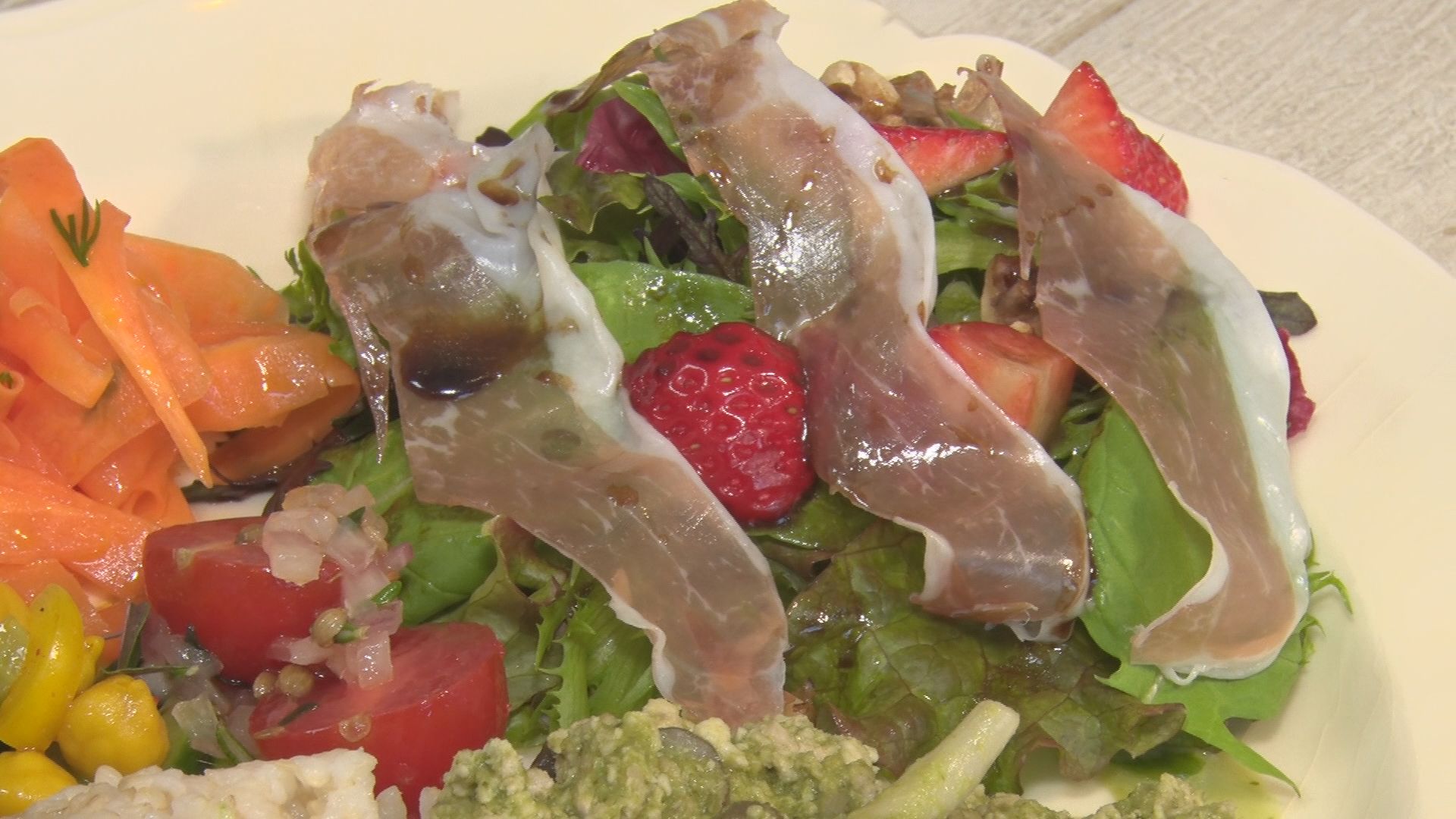 サラダに添えられているのは生ハム。八ヶ岳山麓の野菜や夏イチゴと相性抜群です。