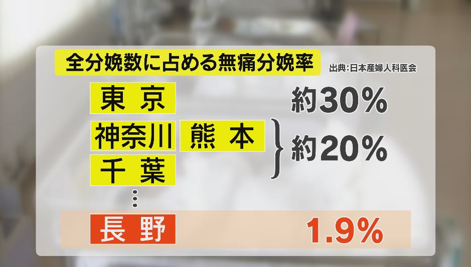 増加傾向の無痛分娩。ただ都道府県によってばらつきがあり、東京は30%に迫っていますが、長野県はまだ1.9%。