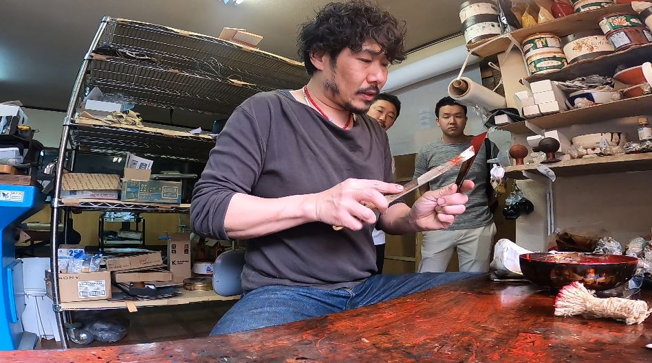 ステーキナイフのバトンは木曽へ。仕上げの漆塗りを任されたのは、職人歴16年の岩原裕右さん(45)。