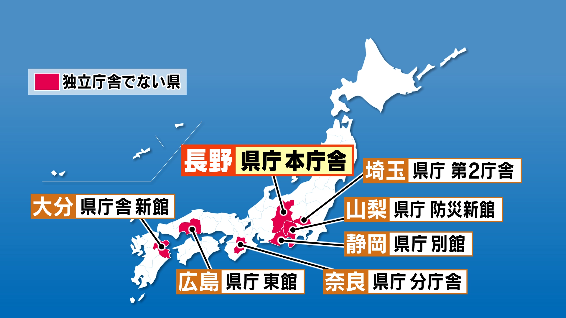 長野以外の6県は他の部局と一緒ですが、分庁舎や別館にあり主に本庁舎の中というのは長野だけ。独立庁舎設置は長く県の課題となってきました。