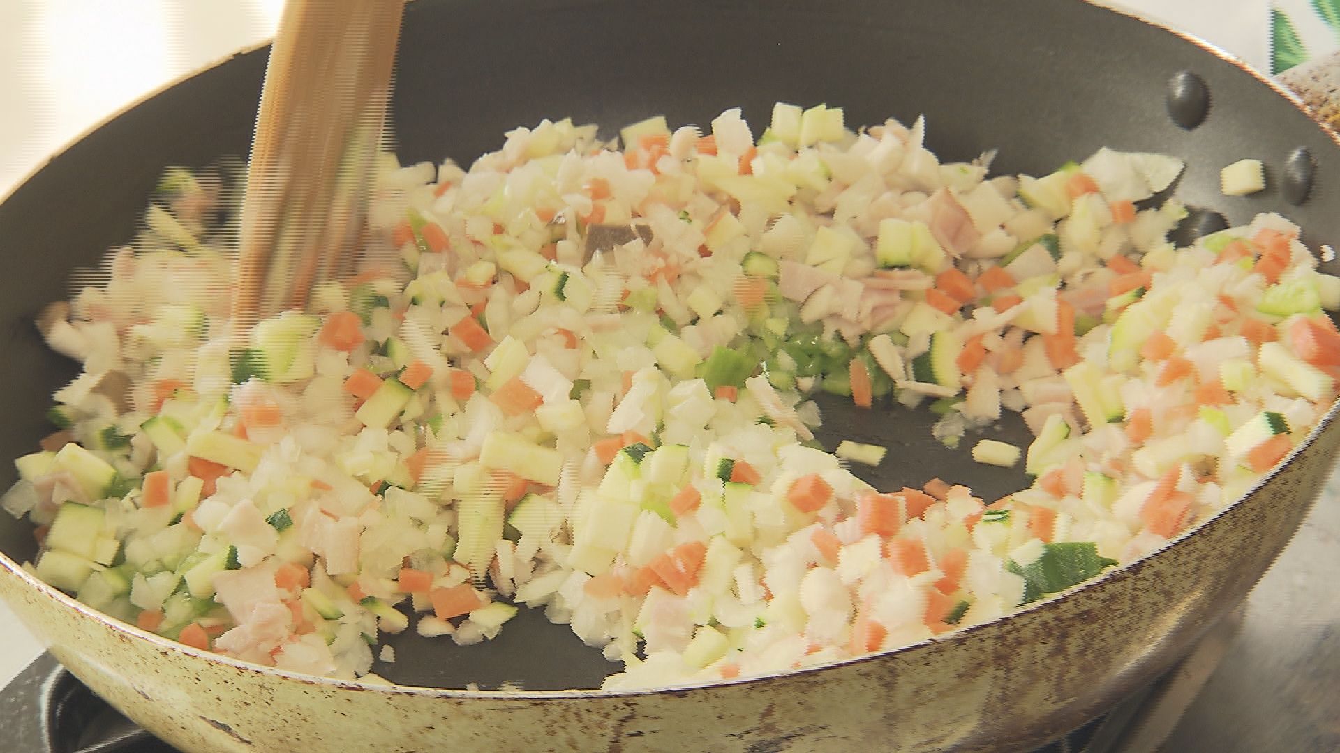 さいの目切りにしたズッキーニ、タマネギ、ピーマン、ニンジン、ベーコン、ブナシメジを炒めます。