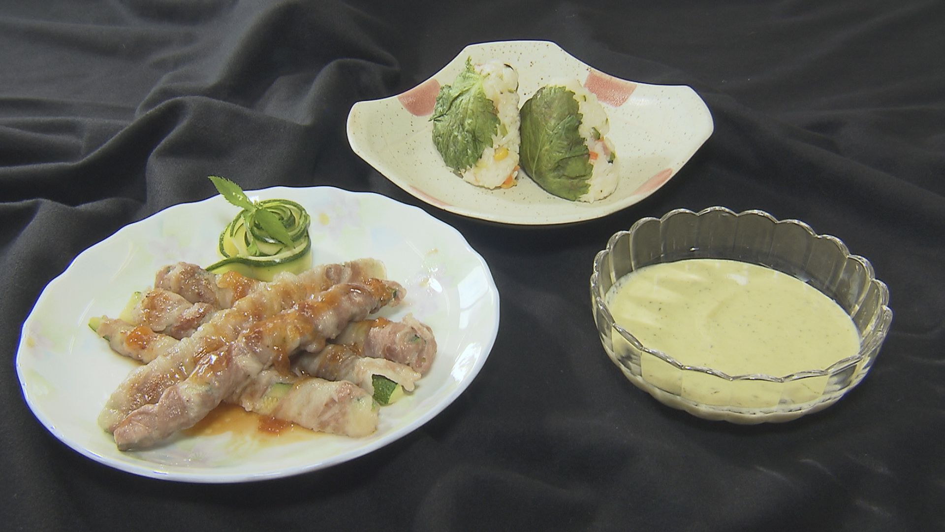 左からズッキーニの肉巻き、チャーハン風おにぎり、冷製ポタージュ
