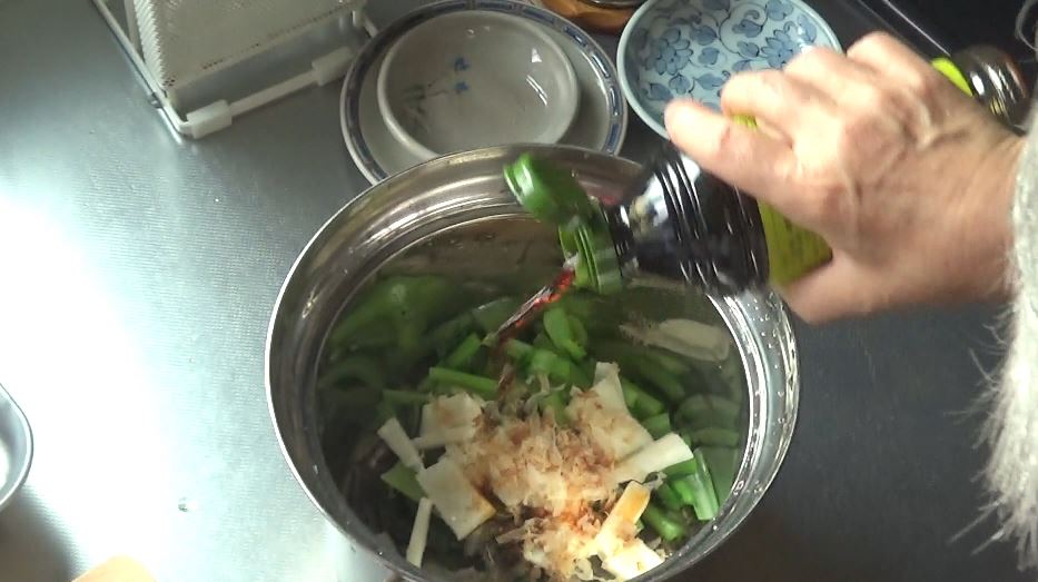 続いては「切り干し大根」。切った食材を油で炒めたらビミサンで味付け。