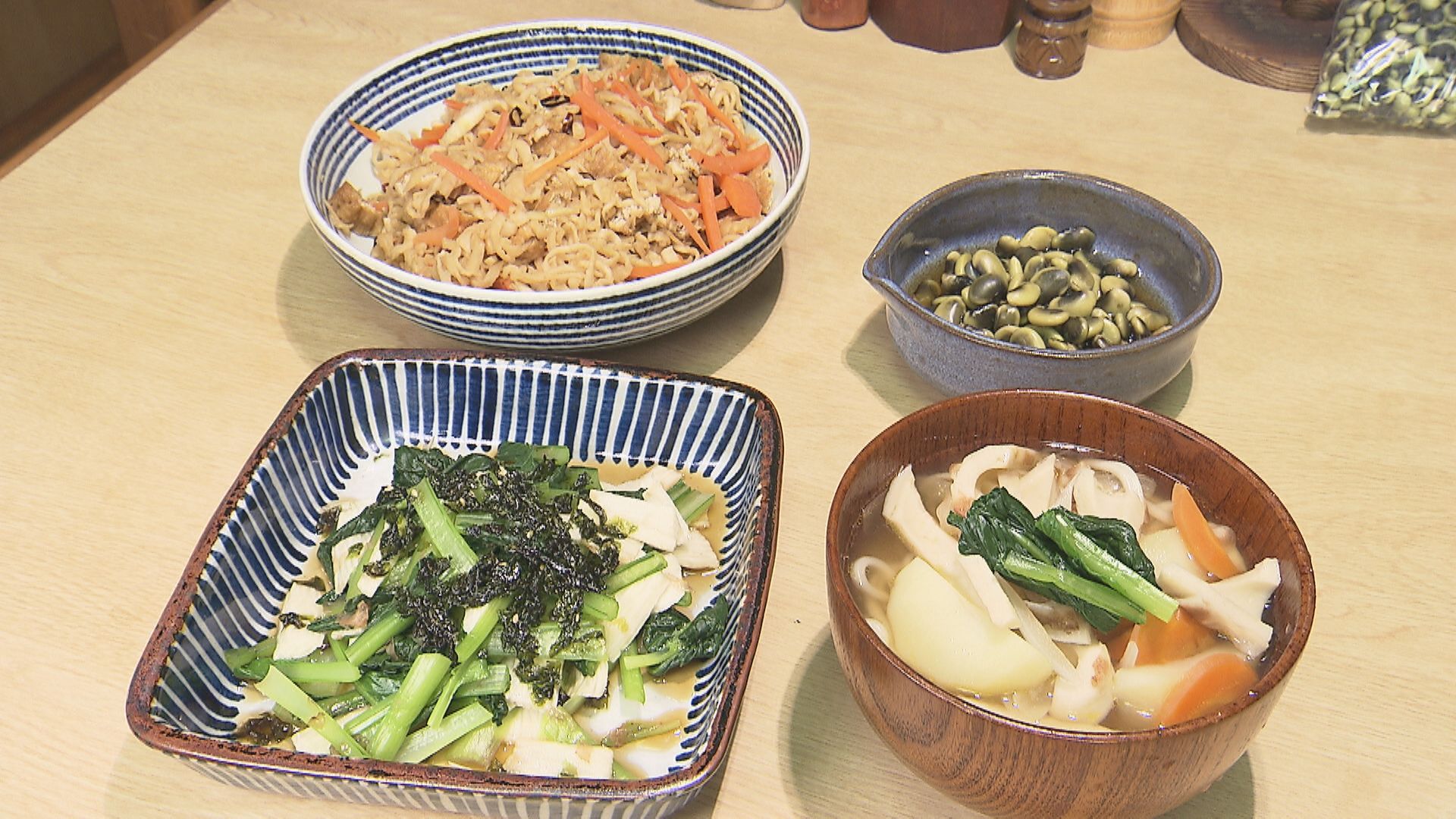 左上:「切り干し大根」、右上:「くらかけ豆のおひたし」、右下:「煮込みうどん」、左下:「小松菜と山芋のおひたし」