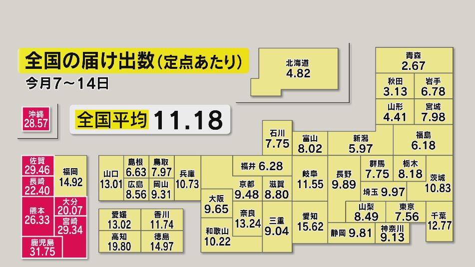 全国でも増加傾向で、14日までの1週間の定点当たりの届け出数は、平均で11.18人。