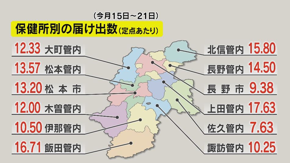 保健所別では、上田17.63人、飯田16.71人、北信15.8人、長野14.5人などとなっています。