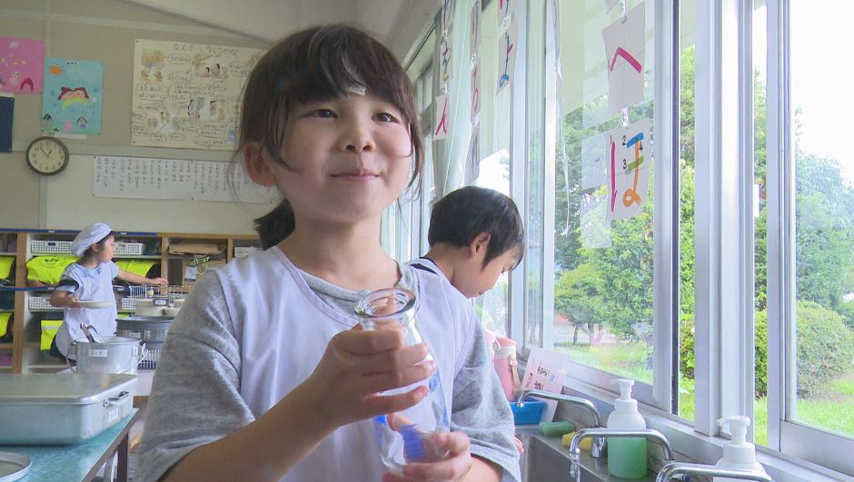 給食を終え、児童が牛乳瓶を洗い始めました。