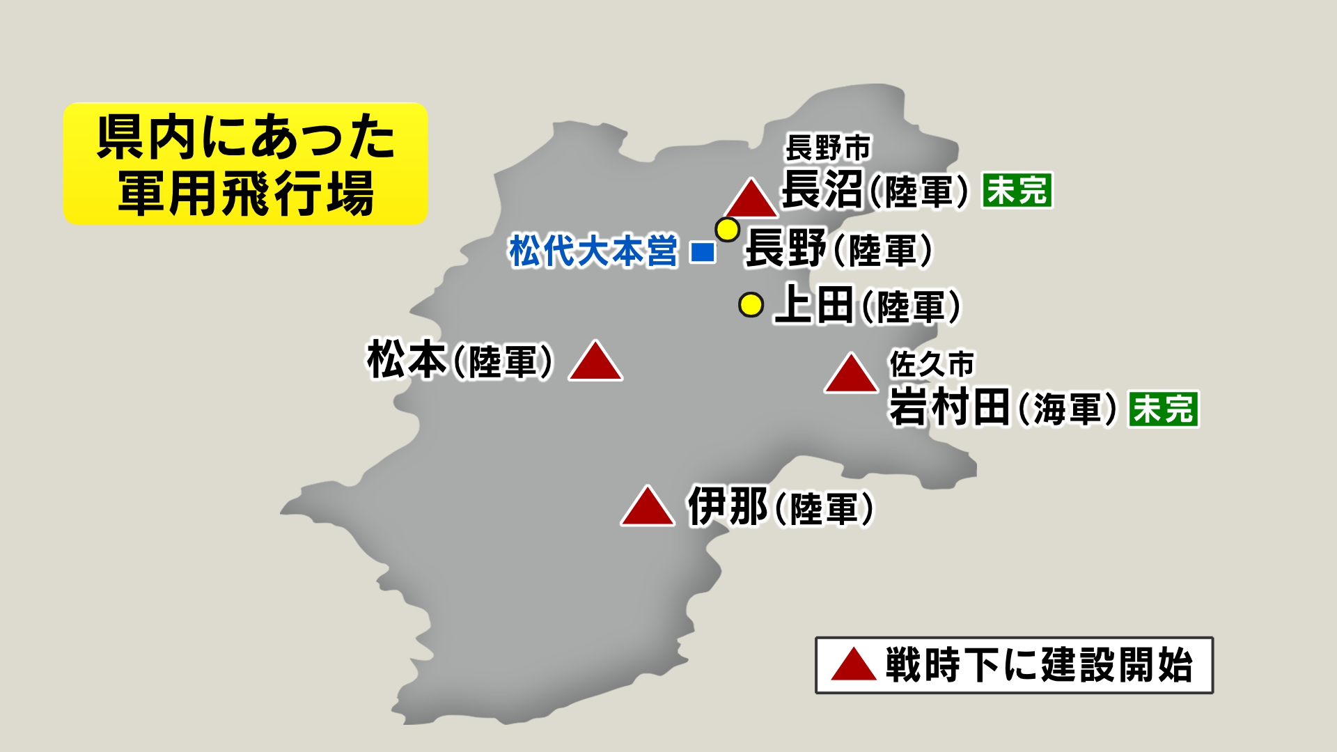 長野県内には戦前から長野と上田の2ヵ所に飛行場があり、戦時中に長野市長沼、佐久、松本、伊那で相次いで建設が始まりました。