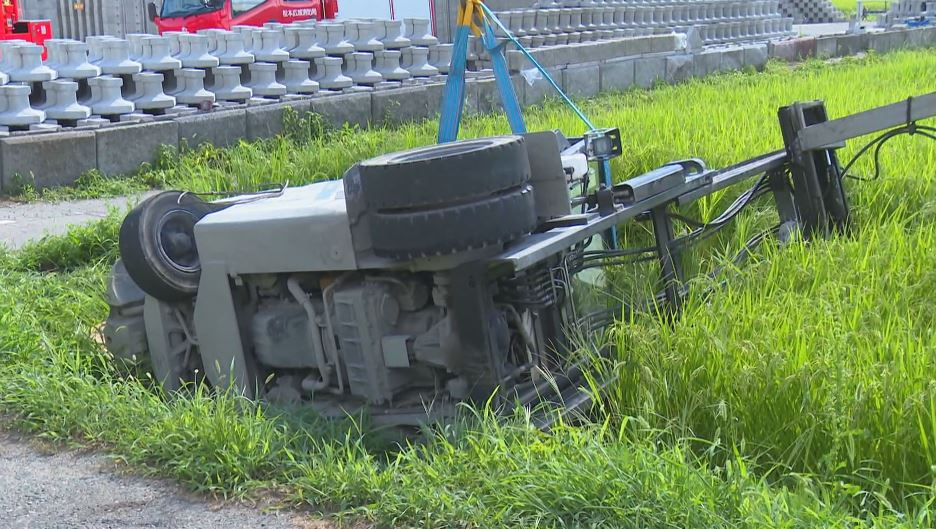 青々とした水田に横倒しになっているフォークリフト。近くでは男性が担架に乗せられ、救急隊員が心臓マッサージを施していました。