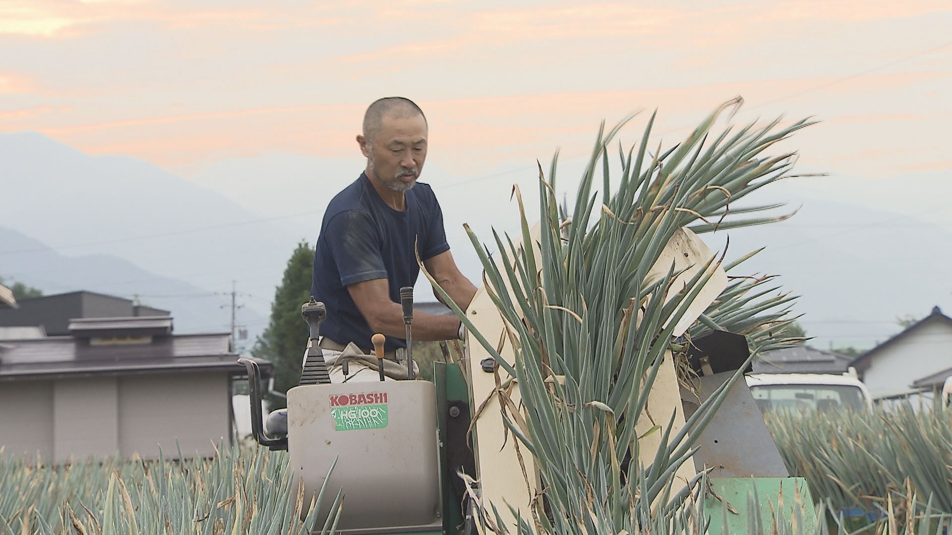 「新幸福ねぎ」の畑。機械を操って収獲しているのが「生みの親」小林庄二さん(60)です。