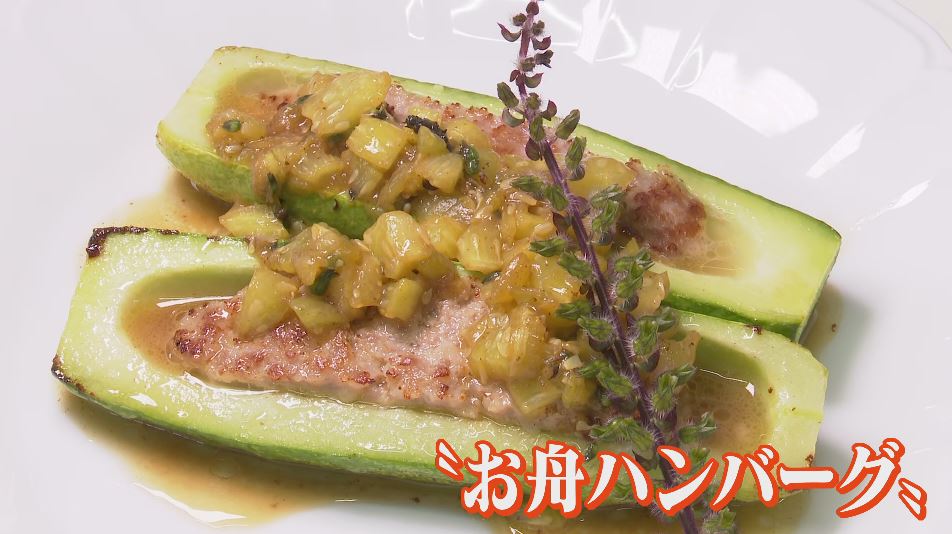 ひと通り火が通ったら、酒を加え2分ほど蒸し焼きに。最後に、くりぬいたキュウリの果肉としょうゆを和えたソースをかければ、「古太きゅうり」を船に見立てた「お舟ハンバーグ」の完成です。