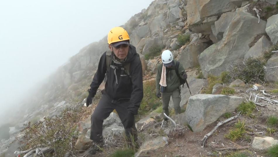 御嶽山頂直下の斜面を歩く2人。愛知県刈谷市の野村敏明さん(64)と弟の正則さん(61)です。