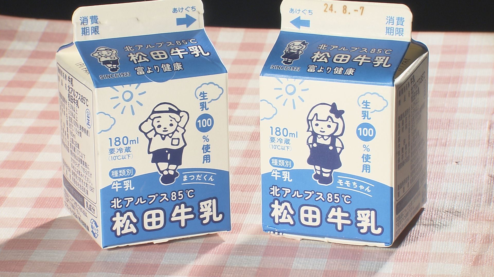 新たに生産が始まった「紙パック牛乳」。パッケージには「まつだくん」が引き継がれ反対側にはガールフレンドの「モモちゃん」も。