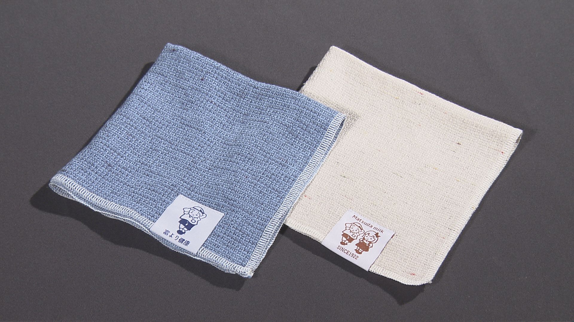 青には「まつだくん」と「富より健康」のキャッチフレーズ、ベージュには「まつだくん」と「モモちゃん」の2人が描かれた「タグ」が映えます。