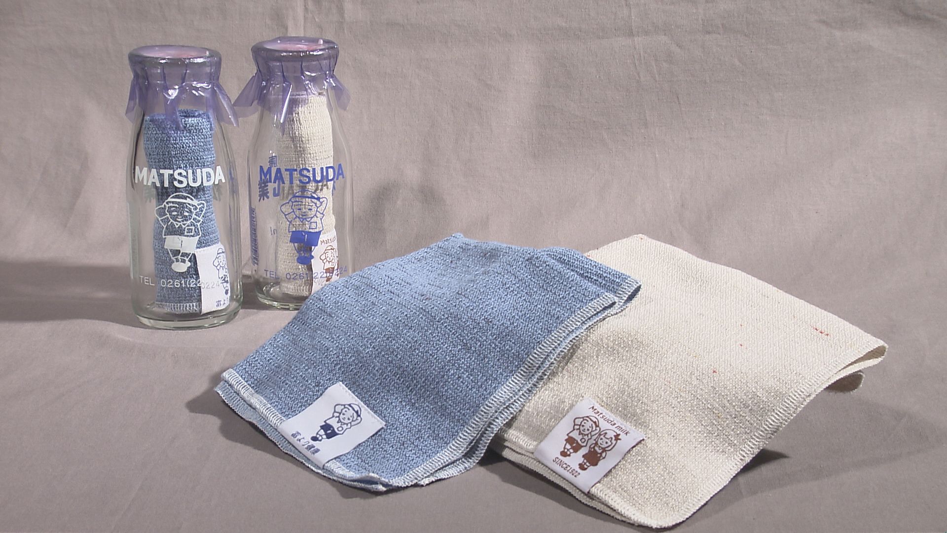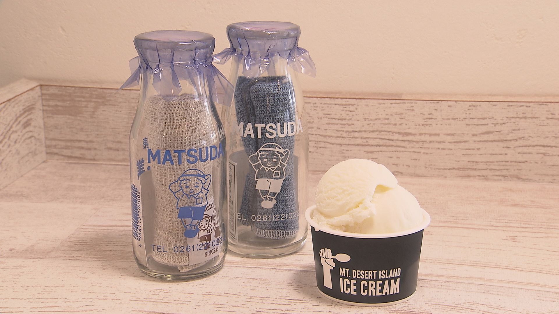 左:空き瓶にミニタオルを入れ販売 右:松田乳業の牛乳を使用したアイスクリーム