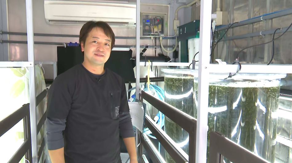 水槽の中で育つ海ぶどう。養殖を始めたのは地元出身の横山健二さん(36)です。