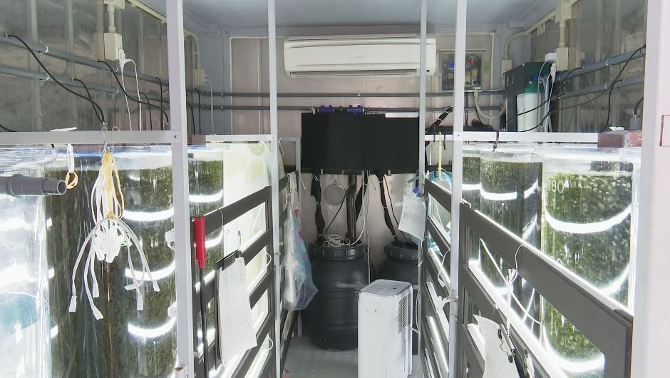 光を当てて光合成を促進。水温を一定に保つため室内はエアコンで26℃から27℃に保ちます。そうして1カ月ほど、育てると、収穫の頃合いに。