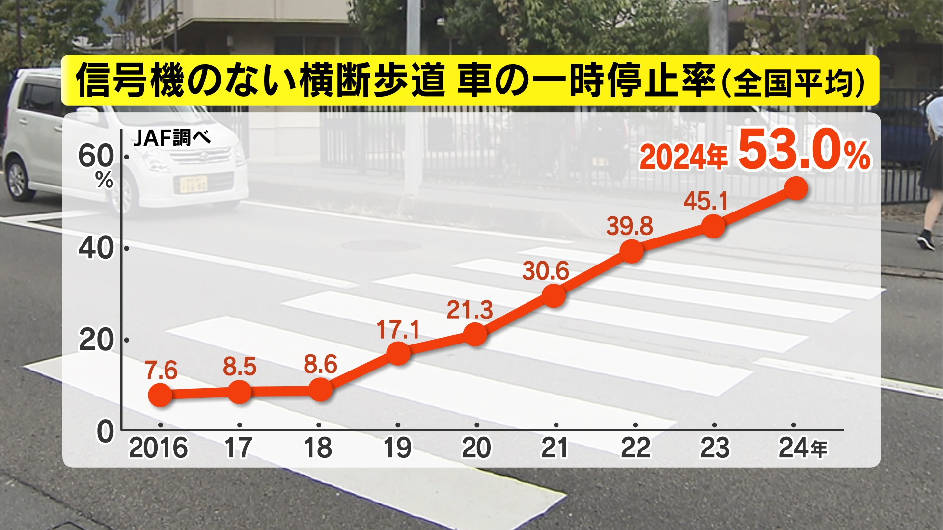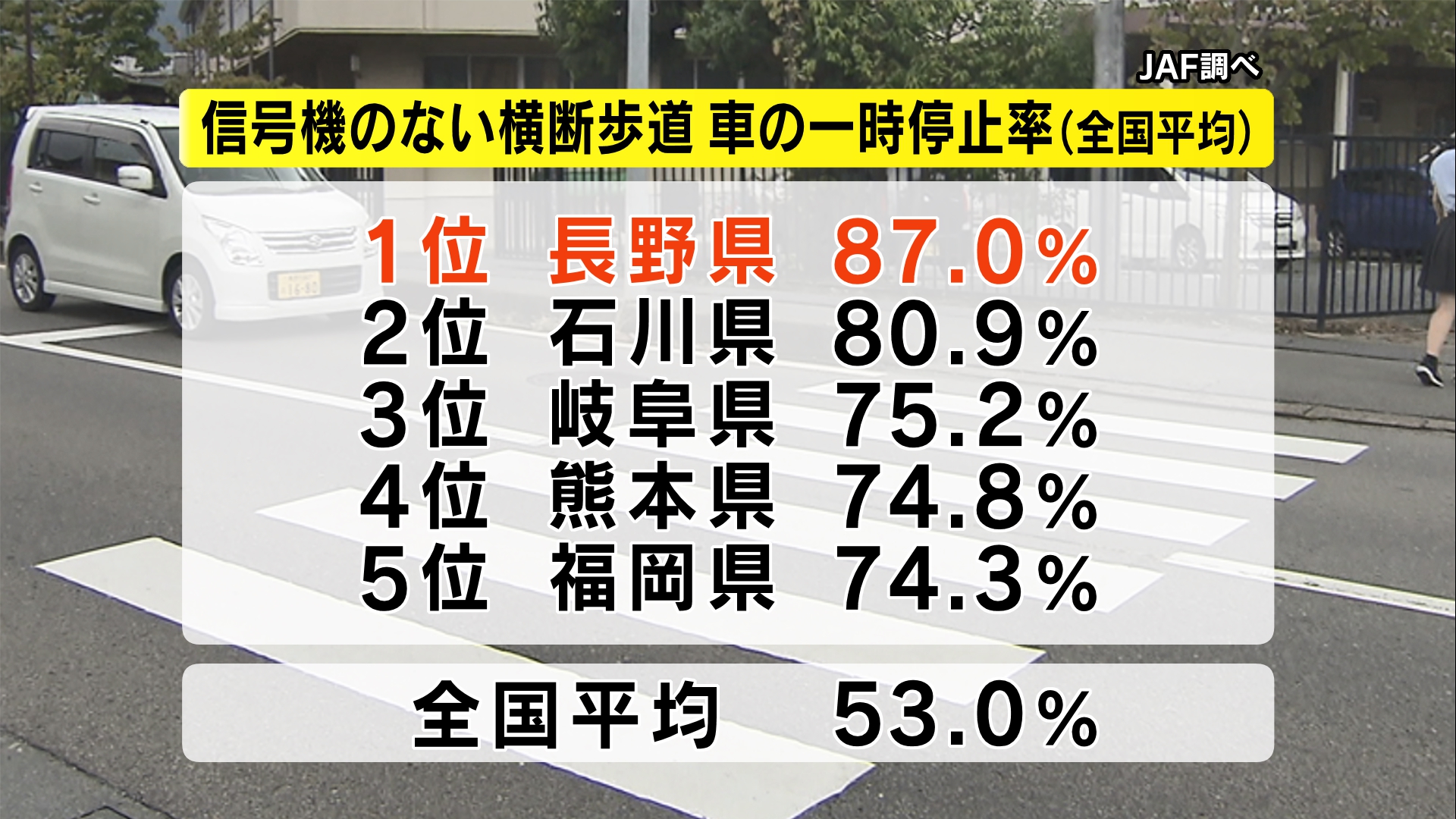 JAF(一般社団法人日本自動車連盟)は8日、信号機のない横断歩道での車の一時停止状況の全国調査の結果を発表し、長野県が9年連続全国1位だったことがわかりました。全国平均は53%で長野県は87%でした。理由は歩行者のアイコンタクトとお辞儀。