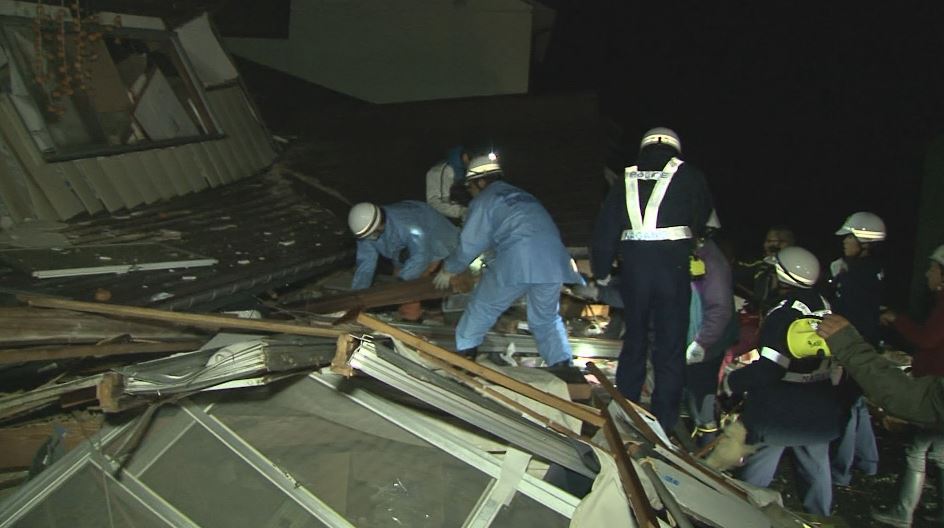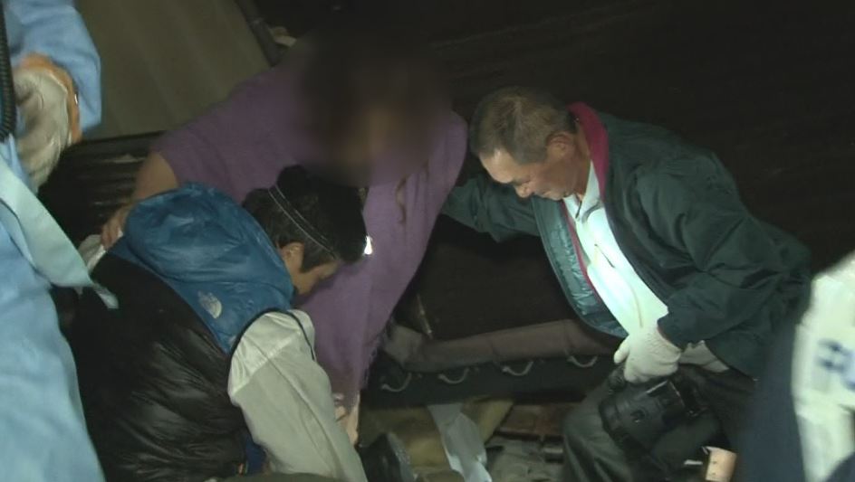 神城断層地震(2014年11月22日)で倒壊した家から住民を救出