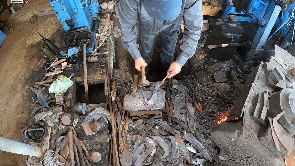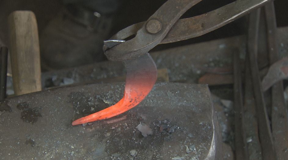 鎌の頭と柄をつなぐ「コミ」を作る作業。鋼を曲げる難しい工程です。