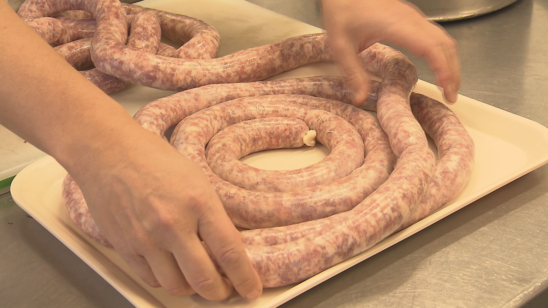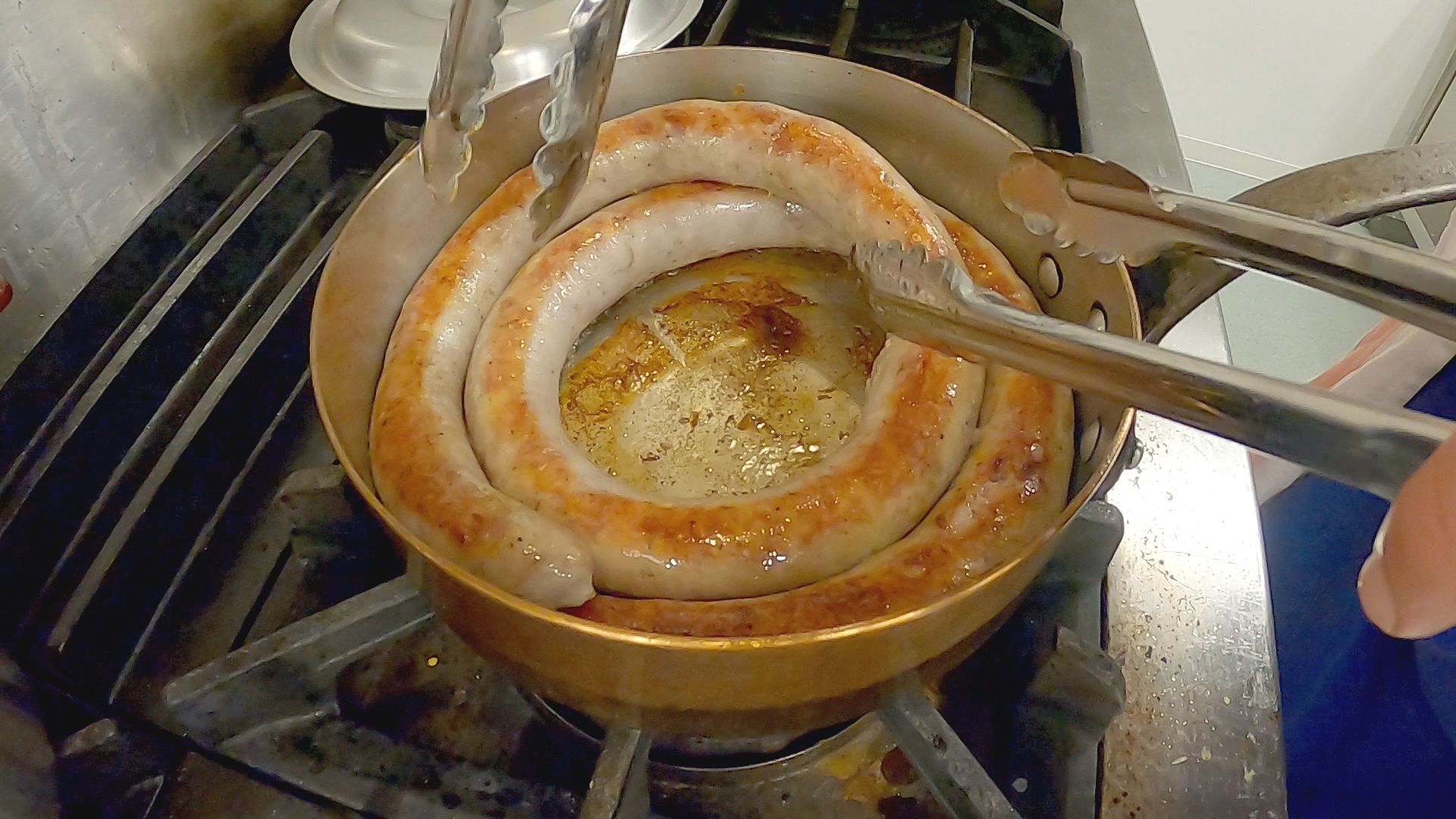 ミンチを腸詰めにしたらソーセージは完成。ボイルせず、提供する際にじっくりと焼き上げるのが「フランス流」です。