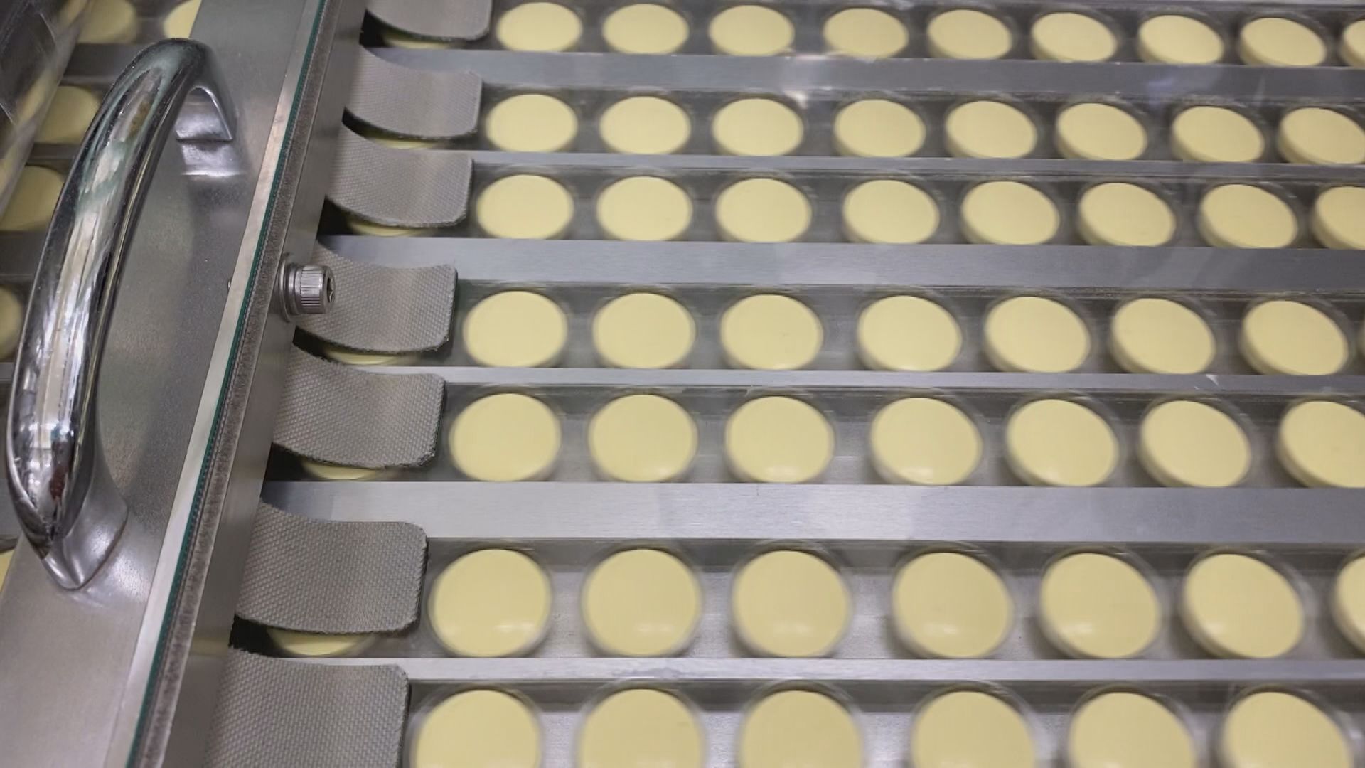 レーンを流れる黄色のタブレット菓子。発売から44年を迎えた「ハイレモン」です。