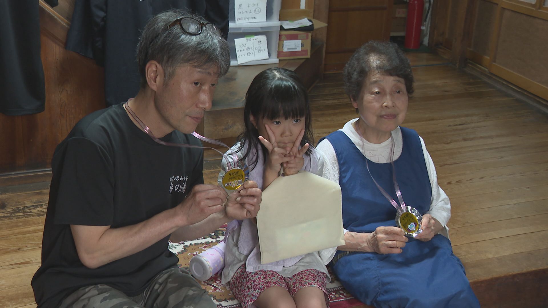 近所の小学生から贈られた金メダルをかけて記念撮影
