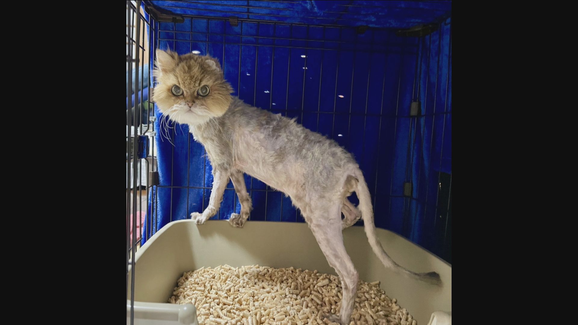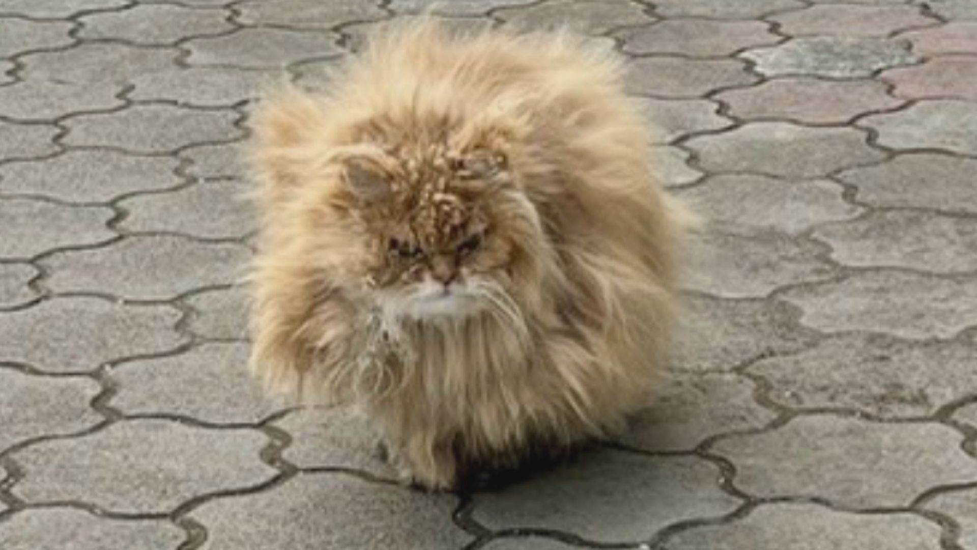 2024年11月、長野市内で保護されました。そのときの様子です。「コンビニ店の前に衰弱したネコがいる」保健所に通報がありました。長い毛がフェルト状に固まり、足も動かせない状態でした。