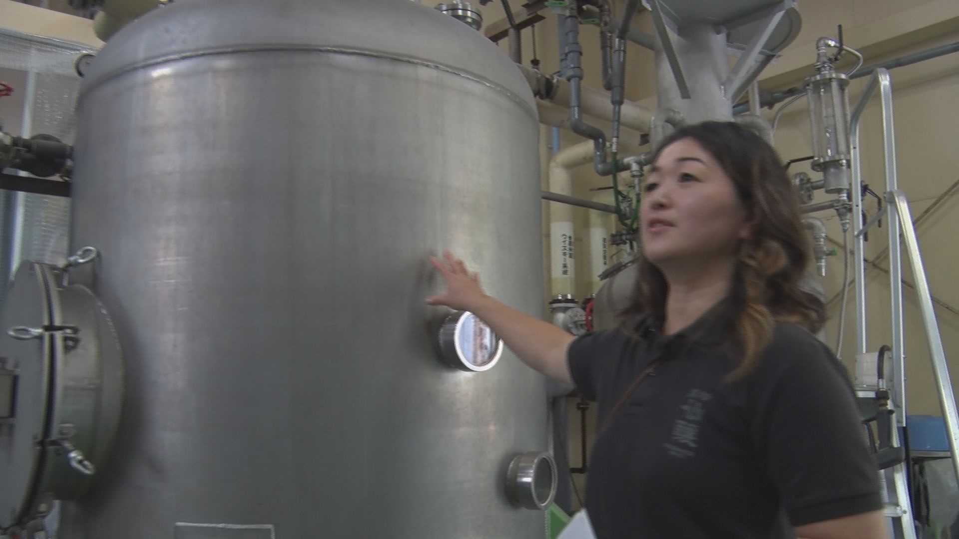 減圧蒸留機の前で説明する仙醸・シャープ仁妙さん