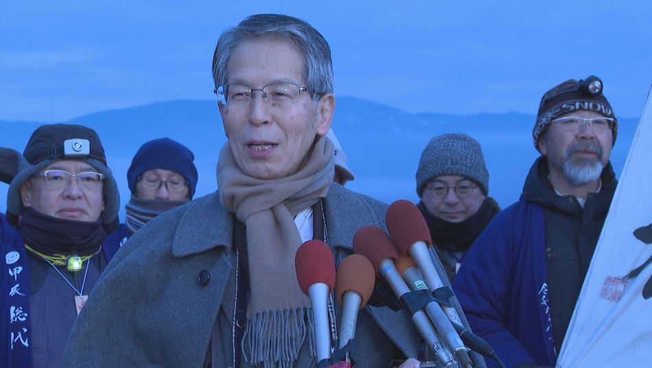 「御神渡り」の観察が続く諏訪湖。20日の最低気温は3月並みの氷点下0.4℃。集まった宮司や総代は思わず。