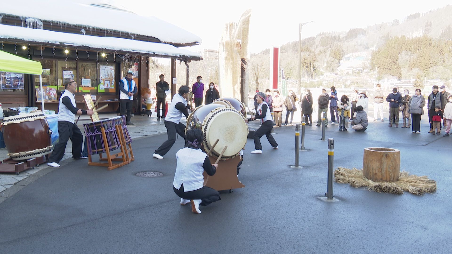 有料区間から1キロほどの場所にある道の駅は記念イベントを開催。沿線の7つのおやき店から集めたおやきに、中条産のもち米と小豆で作ったおしるこ。