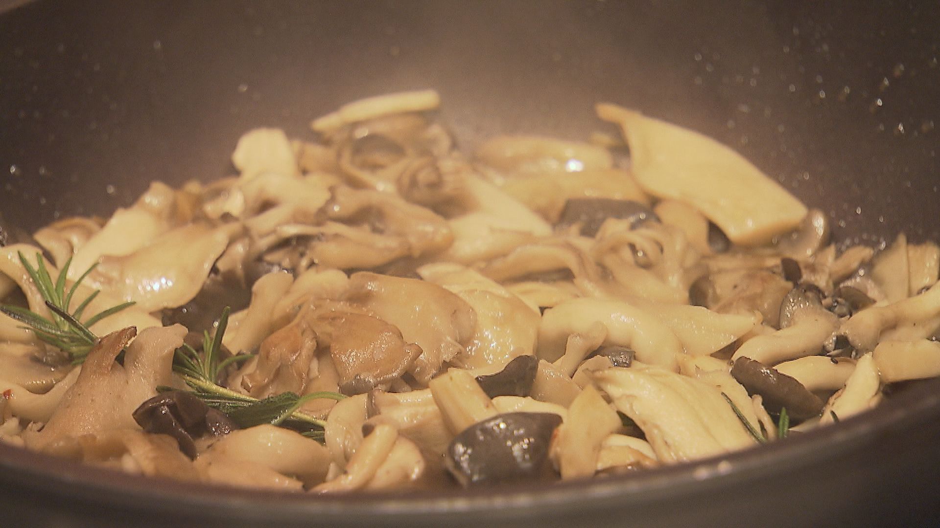 信州産キノコにシチリアの「魚醤」をかけたキノコの地中海風ソテー。卵にコーンビーフを入れて焼き上げたイタリアのオムレツ、「フリッタータ」。