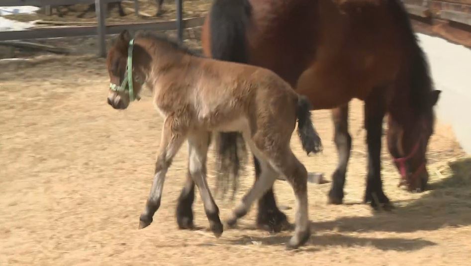 長野県木曽町開田高原の「木曽馬の里」で2月22日に生まれ、4日ほどで放牧デビューしました。