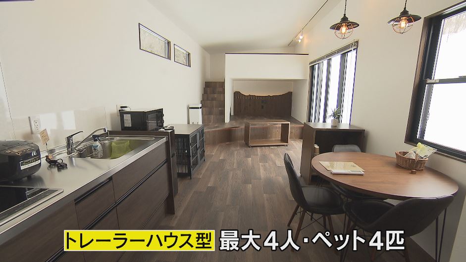 トレーラーハウスは最大4人、ペット4匹。キャビンタイプは最大11人・ペット7匹。どちらも目の前にあるゲレンデの景色を楽しんでもらおうと大きな窓ガラスが設置されています。