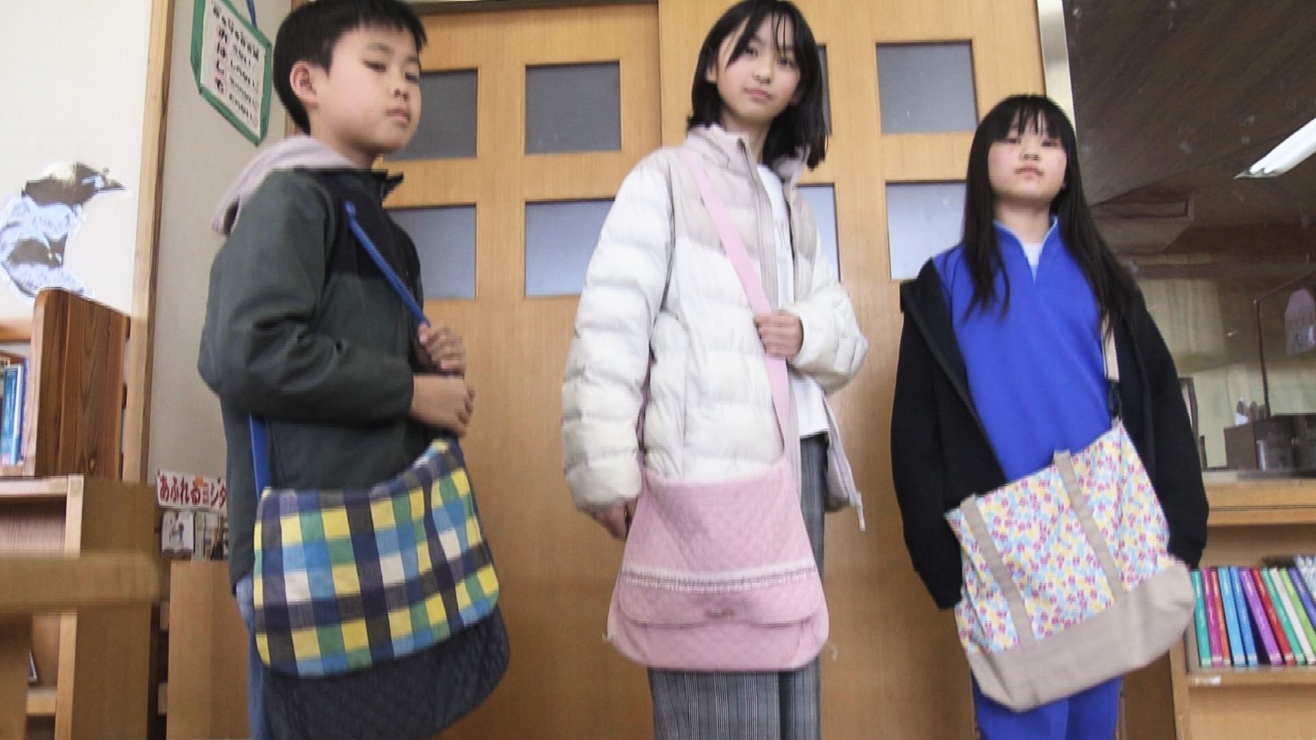 学校では入学後、各家庭に「図書袋」の用意を依頼しています。形は「肩掛け式」で大きさや柄は自由です。