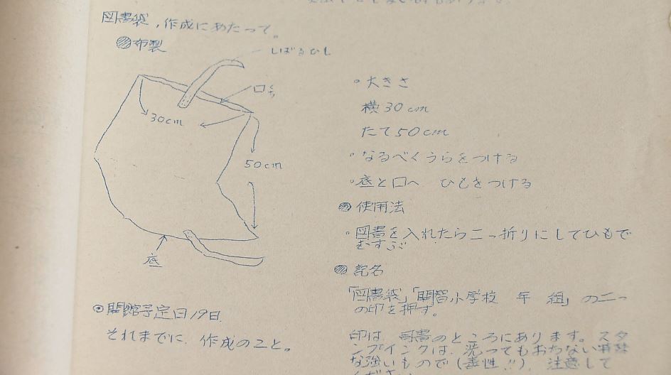 展示されているのは1971年・昭和46年、開智小の「図書館だより」。紙製の図書袋を廃止し、布製の袋を準備するよう各家庭に求めています。二つ折りにして両サイドにつけたひもで結ぶ形です。