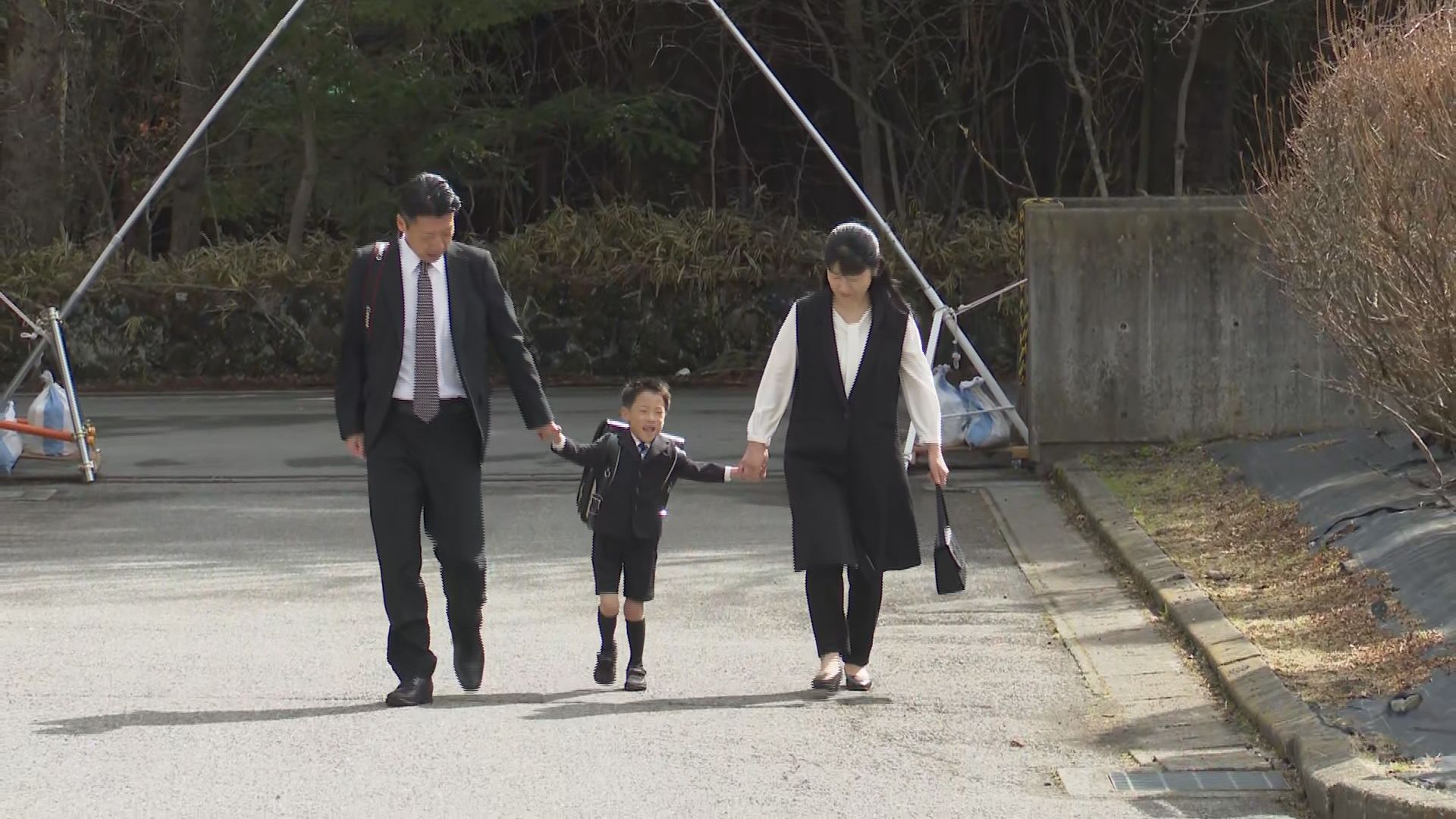 両親と手をつなぎ登校する関野竜佑ちゃん(6)
