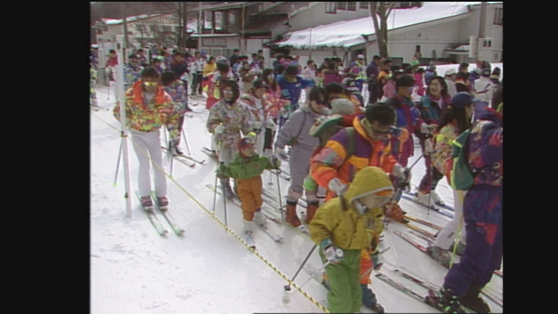 ゲレンデを埋め尽くす、多くのスキーヤー。1994年の映像です。