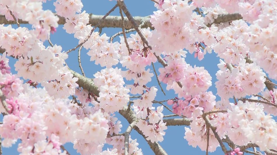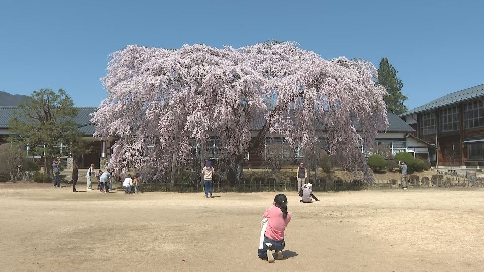 信州の桜です。長野県飯田市ではシダレザクラと古い木造校舎の見事な共演を見せ、多くの人が楽しんでいます。一方、名所の1つ須坂市の臥竜公園も9日開花しました。