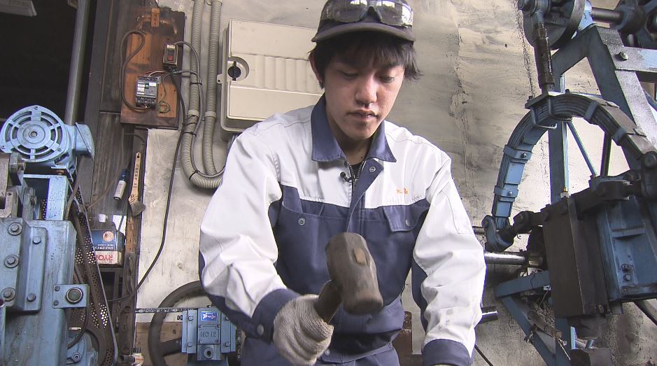 真っ赤に熱せられた鋼に金槌を打ち付ける若者。松川町出身の大木島蓮さん19歳です。