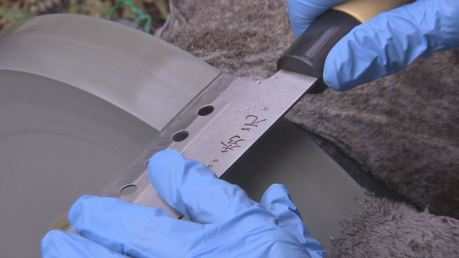 少しずつ慣れてきた大木島さん。5分ほどで1本を研ぎ終えました。