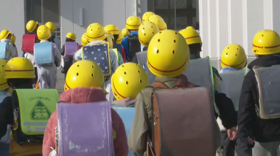 児童が全員、「ヘルメット」をかぶって登校していました。