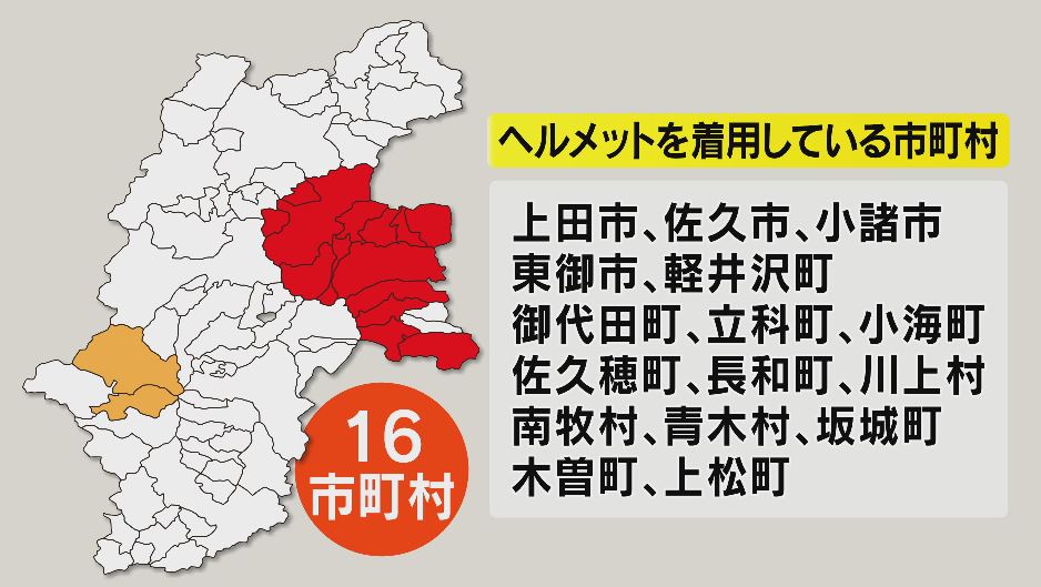 ほかの地域ではどうなのか、NBSが県内77市町村に取材したところ、登下校時にヘルメットを着用するルールがあるのは対象の学年などに違いはあるものの、佐久市を含めて16市町村。