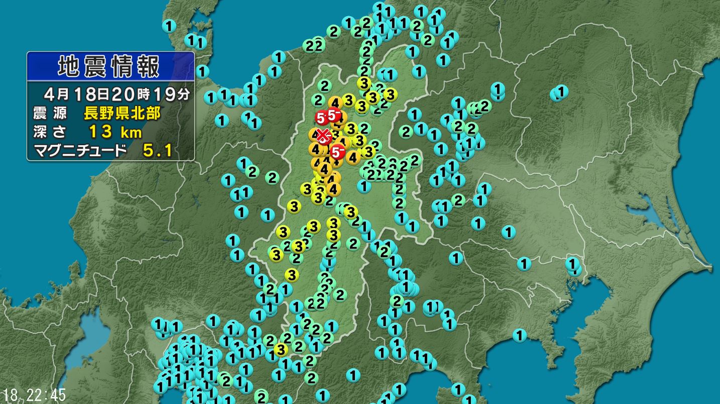 18日午後8時19分ころ、長野県内で地震がありました。震源地は、長野県北部(北緯36度、東経137度)で、震源の深さは13km、地震の規模(マグニチュード)は5.1となっています。