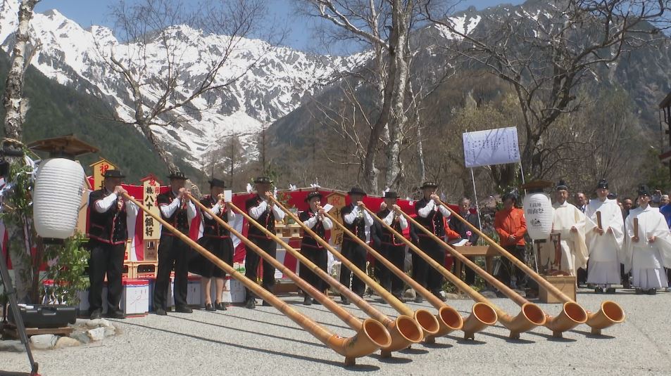 上高地に響くアルプホルンの音色。河童橋のたもとで開山祭が行われました。