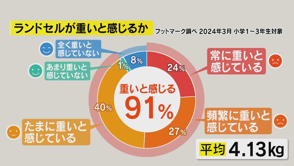 実際、2024年学校用品などを販売するフットマークが小学1年から3年までを対象に行った調査では90%以上が「通学時にランドセルが重いと感じる」と回答。