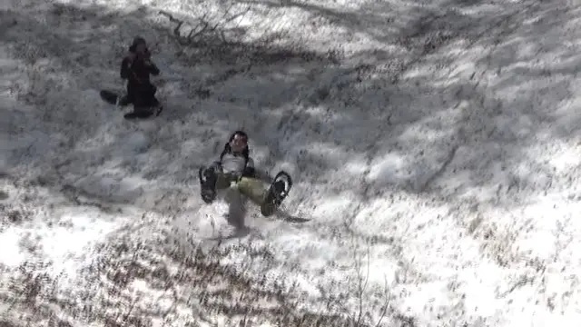 袋の中に緩衝材を入れ雪の上を滑ります。飯山地方では「ケツゾリ」と呼ぶ伝統の遊び方です。